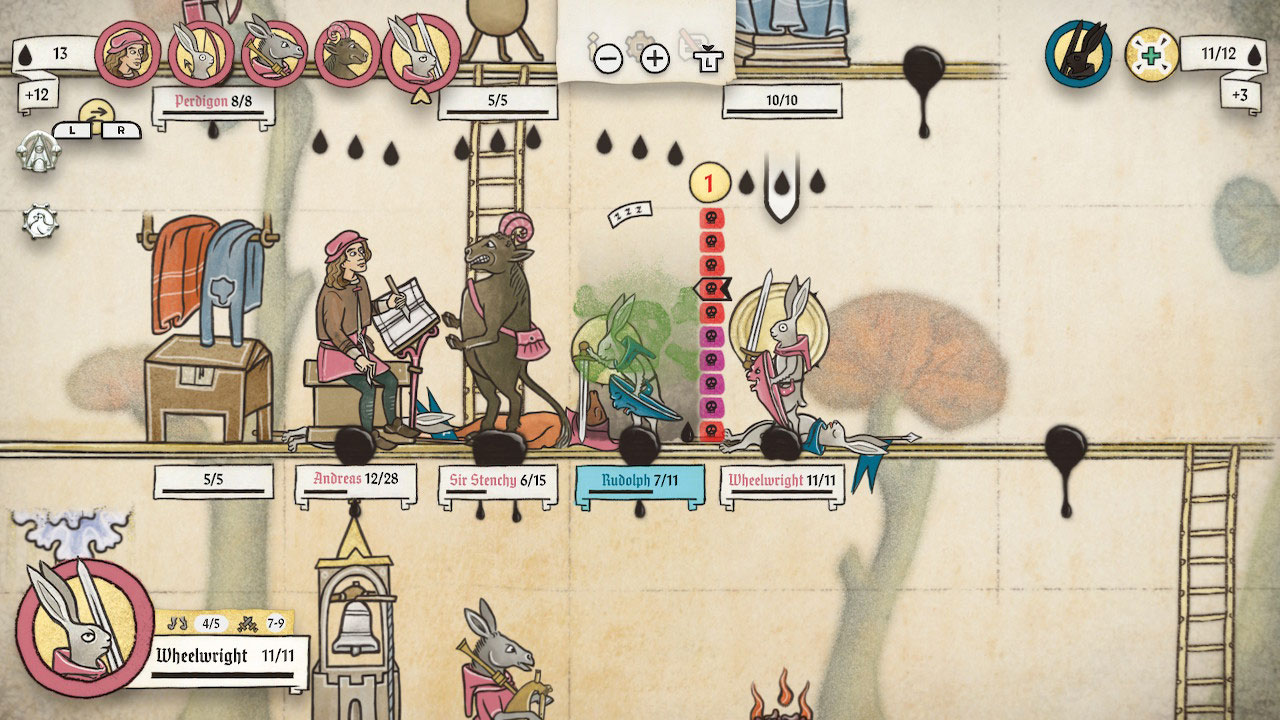 Die Oberwelt ist ein Spielbrett mit verschiedenen Routen und Ereignisfeldern und jede Schlacht endet, wenn alle Figuren oder ein Meister ihrer HPs beraubt sind. Eure Streitmacht agiert auf extrem reduziertem Terrain, manchmal nur eine Ebene, maximal vier Stockwerke, durch Leitern verbunden, sodass es tückisch eng wird. Jedes Feld und jeden Schritt berechnend, verschiebt Ihr Lanzenträger, Bogenschütze, Meister Lampe und Katzenbischof, bufft Eure Krieger mit Heiligenscheinen und stoßt Feinde, die zu nahe am Rand stehen, einfach von der Buchseite runter. Tusche ist die wichtigste Ressource, außerdem sammelt Ihr Prestige und Gold und über 170 Untiere, Talente und ”Handaktionen”, die Euer Wissen und Können steigern.