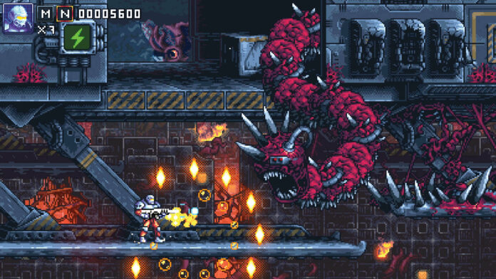 Wie beim Vorbild gibt es zwei Waffenslots, die mit unterschiedlichen Gattungen wie Laser, Dreifachschuss oder Granatwerfer belegt werden können. Anders als bei Contra sind diese jedoch ausbaubar, wenn man mehrere gleiche Icons einsammelt. Die Levels schicken Euch entweder allein oder zu zweit durch Wälder, Laborkomplexe, eine Stadt und sogar über einen assimilierten Zug sowie die Außenhaut eines riesigen Raumschiffs. Am Ende wartet jeweils ein Bossgegner. Das Spielgeschehen ist schnörkellose Run’n’Gun-Action ohne große Finessen: einfach Controller in die Hand nehmen und loslegen. Je nach gewählter Schwierigkeit hat man natürlich mehr oder weniger an den ballerwütigen Gegnern zu knabbern. Für Motivation nach dem Durchspielen wird lediglich durch zusätzliche Outfits gesorgt, deren Teile nach Belieben austauschbar sind, um die Spielfiguren zu individualisieren.