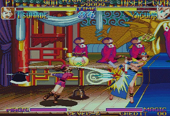 Jetzt prügelt sich auch Hudson in die Spielhalle durch. Bei Kabuki Klash tretet Ihr mit acht bekannten japanischen Anime-Figuren an, die allesamt mit Waffen daherkommen. Vom fetten Sumo, der mit seiner Keule Baseball spielt (mit Euch!) über die putzige Tsunade mit ihrer riesigen Axt bis zur kindlichen Zauberin, die ihren Schoßhund (etwa doppelt so groß wie sie selbst) mitgebracht hat. Neben der obligatorischen Energieleiste findet Ihr am unteren Bildschirmrand eine Magie-Anzeige: Hiermit könnt Ihr Drachen oder Wölfe auf den Bildschirm zaubern, die sich den Gegner vornehmen. Außerdem werfen vorbeifliegende Vögel Extras ab, mit denen Ihr Energie tankt, schneller über den Schirm wetzt oder den Gegner lähmt. Führt Ihr einen der vielen Special-Moves aus (von Feuerball bis Teleport) kommt aber schonmal Eure Waffe abhanden, die Ihr dann wieder aufsammeln müßt.