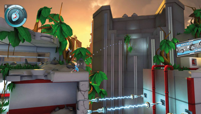 ls junger Blondschopf mit Robo-Begleitung tourt Ihr durch futuristische Umgebungen und habt eine überdimensionierte Wumme im Schlepptau: Mit der könnt Ihr die vereinzelt herumfliegenden Feinde entsorgen, vor allem aber Abgründe überwinden. Schießt Ihr in den Boden, fliegt Ihr im Bogen durch die Luft dort lässt sich in Zeitlupe noch eine zweite Salve ausrichten, was für geschickte Akrobatik sorgt. Dabei haben die Entwickler das Kunststück fertiggebracht, die Steuerung sowohl via Analogsticks als auch Touchscreen vernünftig zu gestalten. Allerdings fehlt auf Dauer etwas die Abwechslung in den Levels, und den Protagonisten geht eine Prise Charme ab für kurzweilige Katapultierstunden taugt das Spiel aber zweifellos.