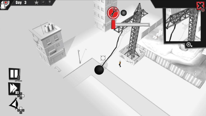 Mit kreativen Mitteln sorgt Ihr dafür, dass Bösewichter ins Jenseits befördert werden – und das natürlich ohne lästige Zeugen. Dabei geht Ihr indirekt vor: Während Euer Opfer in der schwarz-weißen Iso-Welt einem vorgegebenen Pfad folgt, sabotiert und manipuliert Ihr Abrissbirnen, baumelnde Klaviere und andere comic­hafte Utensilien, um Haupt- und am besten auch verschiedene Neben­ziele zu erfüllen. Kill the Bad Guy ist allerdings oft undurchsichtig und erklärt sich kaum, die Pad-Steuerung fällt kompliziert aus. Nach einfachem Auftakt zieht die Schwierigkeit schnell an, manche Rätsel könnten mehr ­unterschiedliche Herangehensweisen vertragen.