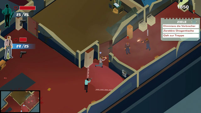 Welche Einflüsse die Macher von LA Cops verarbeitet haben, offenbart sich sofort: Stilistisch dient das Beastie-Boys-Video zu Sabotage als Hauptvorlage, spielerisch ist Hotline Miami das Vorbild. Hier wie dort ist es Eure Aufgabe, in Gebäuden vorsichtig die Räume abzuklappern und dabei versammelte Ganoven auszuschalten, ohne erwischt zu werden in der Regel haucht Ihr trotz Energieleiste schon bei einem Treffer das Leben aus. Ein paar signifikante Unterschiede heben LA Cops ab: So blickt Ihr nicht von oben, sondern isometrisch auf das Geschehen, das sich stufenlos drehen und begrenzt zoomen lässt. Allerdings macht das die Orientierung wider Erwarten eher schwerer als leichter, zumal unnötige Bildschirmanzeigen das Sichtfeld einschränken.