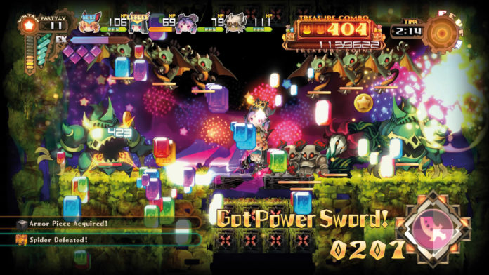 Wegen des festen Zeitlimits sind die Level nie zu groß, dennoch kann das dem Spaß ordentliche Dämpfer versetzen. Wenn es um die Monster geht, explodiert das Geschehen: Ihr hackt Euch durch die Gegner, setzt Spezialtechniken ein und wechselt frei den aktiven Helden, um mit verschiedenen Strategien den Feinden auf den Pelz zu rücken. Tut Ihr das gut genug, aktiviert sich der ”Fever”-Modus, in dem die Menge an Beute dermaßen ansteigt, dass man manchmal nichts mehr außer fliegendem Geld sieht. Die inaktiven Helden sitzen in Totem-Manier übereinander und können durch gegnerische Angriffe verloren gehen. Sammelt sie wieder ein, denn jeder Kopf bringt Status-Boni und ermöglicht Spezialangriffe.