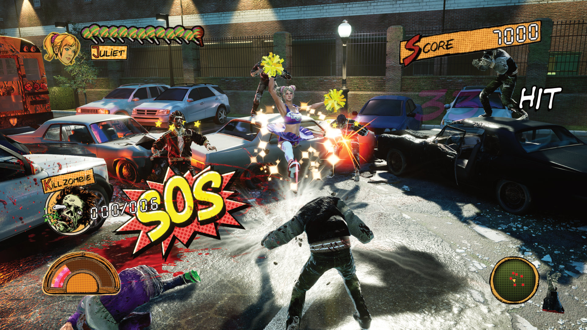 Ob es deshalb wirklich eine Neuauflage gebraucht hat, die sich zudem an die Brust heftet, dem Original weitgehend treu zu bleiben? Dragami Games sieht das so und beschert uns darum RePOP. Das wartet zumindest auf der Xbox mit überwiegend stabilen 60 fps und hoher Auflösung auf, trotzdem sind die alten Charaktermodelle und Umgebungen nicht sonderlich attraktiv. Heldin Juliet Starling bewegt sich zudem bei ihren Attacken mit Kettensäge und Pompons gefühlt etwas zu flott, weshalb das Geschehen stets hektisch und öfters unübersichtlich wirkt. Ansonsten gibt es ein paar leidlich relevante Detailänderungen (so ist die Ballermodifikation der Kettensäge nun dezent besser nutzbar) und einen ”blutarmen”, alternativen Modus. Dafür gingen aus lizenzrechtlichen Gründen die meisten namhaften Songs des damals sehr launigen Soundtracks über Bord: Lediglich ”Lollipop” von The Chordettes ertönt noch im Shop-Menü, die anderen stimmungsfördernden Titel wurden durch unauffälliges Gedudel ersetzt.