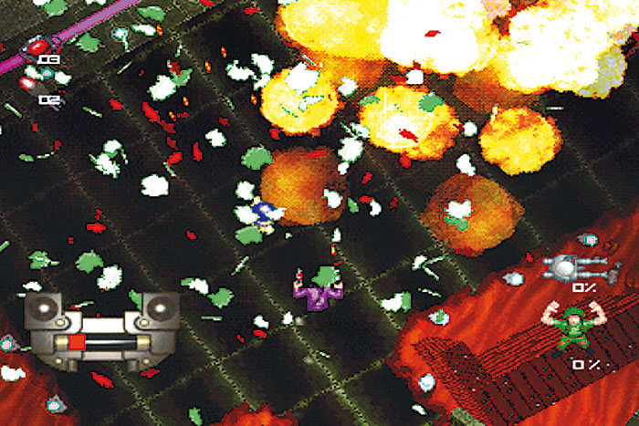 Im Optionsmenü wählt Ihr zwischen rotierender Ansicht (Euer Sprite blickt immer nach oben) oder der ausschließlich scrollenden Perspektive, bei der sich der Held selbst dreht. Mit den Symboltasten schießt Ihr beliebig in mehrere Richtungen: So feuert Ihr mit dem Dreieck-Knopf nach vorne, die Viereck- und Kreis-Knöpfe bestreichen dagegen Widerstandsnester rechts und links von Euch mit Laserstrahlen. Habt Ihr im Effekt-Overkill von Leuchtfeuern, herumfliegenden Trümmern und explodierenden Munitionskisten einige Hallen gesäubert, wagt Ihr zur Orientierung einen Blick auf die drehbare Karte, die Euch die Position des nächsten Ziels und des Ausgangs verrät. Nach Erreichen des Exits werden Punkte abgerechnet und gefundene Geheim-Abschnitte angezeigt, ein Paßwort erlaubt den Neueinstieg im aktuellen Kriegsgebiet. Vorsicht: Ihr habt nur wenige Continues!