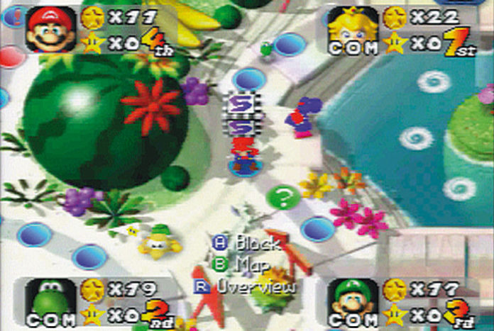 Sechs Würfelwelten erwarten eine Aus­wahl von vier Helden, im Ziel steht Toad mit einem der begehrten Glitzer­schätze. Vor dem Sieg liegt ein harter Weg: In Donkey Kongs Dschun­gel versperren wüste Steinmon­ster den Weg und lassen Euch nur gegen Bestechung (Gold­stücke) passieren, auf Toadstools Ge­bur­tstagskuchen pflanzt Ihr Erdbeer­samen, um die Sterne des führenden Spielers zu klauen. Yoshis Insel wird von hungrigen Wassermonstern bewacht, auf Warios Schlachtfeld schießt Ihr Euch mit Ka­no­nen von Schützen­graben zu Schüt­zen­graben. In Luigis Maschinenraum ­ver­sperren laufende Stahltore den Weg, Marios Regen­bogenburg ist der einzig ­lineare Level – doch am Ende erwartet Euch nicht nur Toad, sondern auch der diebische Bow­ser. Wer fleißig würfelt, darf geheime Welten frei­spielen.