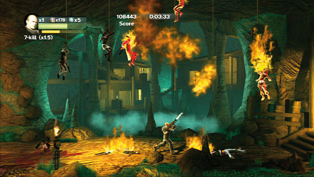 Matt Hazard ist ein grafisch ansehnlicher Mix aus Old-School-Ballereien à la Contra oder Metal Slug und einer Prise Shadow Complex. Matts Erzfeind General Neutronov hat per Zeitmaschine Euer Alter Ego aus 8-Bit-Tagen entführt und Ihr müsst ihn bzw. Euch selbst retten. Die Logik dahinter ist so bescheuert wie nachvollziehbar: Stirbt Pixel-Matt, ist auch der Polygonheld tot. Statt weiter darüber nachzudenken, stürzen wir uns ins Gemetzel, das im Gegensatz zu Eat Lead mit Blut und Splattereffekten nicht geizt. Während Ihr kanadischen Mountys, Piratenskeletten und femininen Kreuzfahrt-Stewards den Garaus macht, sammelt Ihr Extrawaffen wie Schrotflinte, Maschinengewehr, Raketenwerfer und besonders spektakulär einen Flammenwerfer. Gegner hinterlassen nicht nur Lebensenergie und Munition, sondern auch Münzen, mit denen Ihr zwischen den Abschnitten in Ragdoll-Pachinko-Automaten Bonuspunkte ergattert. Den Wiederspielwert erhöhen drei aufspürbare NES-Module pro Level, die Informationen zu fiktiven Spielen aus Matts Karriere freischalten.