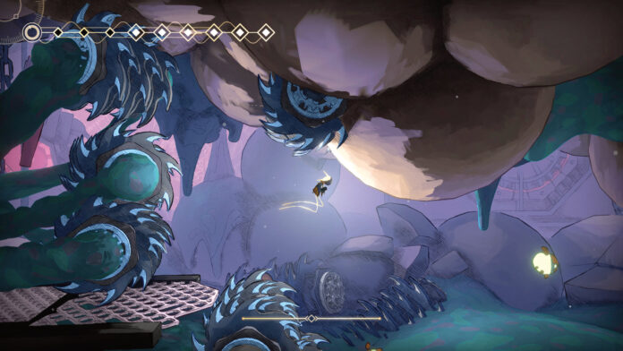 Worum geht es? Die KI-Betreuer einer gewaltigen Weltraum-Arche versagen ihren Dienst und ebnen so den Weg für eine Vollkatastrophe. Ihr schlüpft in die Rolle des titelgebenden Roboters MIO, um das verwinkelte Innenleben des Schiffes zu erforschen, abtrünnigen Maschinen zu trotzen und das drohende Desaster abzuwenden. Das funktioniert alles nach bewährtem Regelwerk, wodurch sich gerade Fans des Genres im Handumdrehen wohlfühlen. Bewegt Ihr Euch eingangs noch träge durch die kompetent verzahnten Eingeweide der Arche, versorgen Euch bald regelmäßige Upgrades mit neuen Bewegungsmöglichkeiten. So schwingt Ihr Euch etwa an Ankerpunkten in luftige Höhen oder krabbelt wie eine Spinne an Wänden und Decken entlang. Damit die Fortbewegung herausfordernd bleibt, gilt es, Eure Ausdauer stets im Blick zu behalten. Nur mit festem Boden unter den Füßen oder mit Hieben gegen passend in der Luft platzierte Feinde und Blüten erholt sich Euer Energievorrat. Daraus resultieren grundsätzlich motivierende Geschicklichkeitspassagen, denen aber gelegentlich frustrierend platzierte Rücksetzpunkte und eine nicht immer präzise Steuerung den Spaß rauben können. Ähnlich verhält es sich mit den fordernden Bosskämpfen, die zwar – wie auch die restliche Spielerfahrung – keinen Innovationspreis verdienen, aber unterhaltsam ausfallen. Sind Euch die Konfrontationen zu knifflig, erleichtern Euch clevere Accessibility-Optionen das Leben. So werden Bosse bei jeder Niederlage abgeschwächt oder Ihr frischt Eure Lebensenergie mit einem kurzen Stillstand auf.
