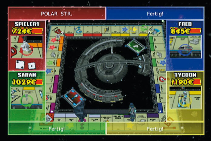 Zwei Modi bietet Monopoly Party: Neben dem gewohnten, abwechselnden Gewürfel und Geschachere vergnügt Ihr Euch mit der namensgebenden Variante. Hier wird immer gleichzeitig agiert – was sich besonders im Spiel gegen die bis zu drei CPU-Teilnehmer angenehm zeitsparend auswirkt. Abwechslung zum klassischen Monopoly-Look bringen vier zusätzliche Sets mit Themen wie Sci-Fi oder Antike. Die Bedienung ist angenehm simpel, selbst diffizile Handelsaktionen gehen locker von der Hand. Allerdings stört die Spielschwäche der KI-Gegner und das dümmliche deutsche Dauergelaber des Moderators.