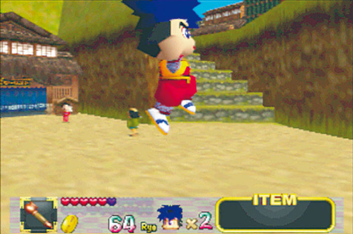 Im Vordergrund steht in jedem Goemon das Jump’n’Run-Element: Der Held und einige Gefährten (in die sich Goemon auf Knopfdruck verwandelt) metzeln sich hüpfend über Brücken und Treppenfluchten, balancieren auf Plattformen oder gar auf dem Rücken eines Drachen. Aus der gleichen Perspektive (die virtuelle Kamera bleibt dem Spieler immer auf den Versen) marschiert Goemon auch durch die idyllischen Städte, die zwischen den einzelnen Levels liegen und bevölkert sind von Händlern, Wachen und Passanten. Über die Jahre wurden diese japanischen Siedlungen grafisch immer detaillierter – aus 2D-Häuserfluchten sind auf dem Nintendo 64 massive 3D-Gebäude geworden. Das Sortiment an örtlichen Anlaufstellen hat sich seit Goemon auf MSX und NES jedoch nicht geändert: Ihr stärkt Euch im Restaurant, kauft Waffen beim Schmied oder wechselt über das Reisebüro in Windeseile zu einem anderen Ort. Die herumlaufenden, mittelalterlich gekleideten Bürger sprechen mit Euch, wenn Ihr ihnen auf die Pelle rückt, geben Tips oder verraten den Weg zum Berg Fujiyama. Doch auch Übeltäter sind in Japan unterwegs: Achtet auf gemeine Taschendiebe, die Euch bei Berührung die sauer verdienten Goldmünzen aus der abnehmen…