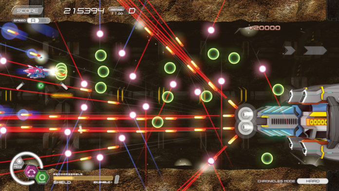 Wo andere Shmups Euch direkt nach dem ersten Treffer ins Nirwana schicken, ist Natsuki Chronicles sehr entgegenkommend: Serienmäßig hat Euer Schiff drei sich mit der Zeit regenerierende Schilde. Weiteren Schutz geben ausgerüstete Extras, so habt Ihr auch im dichtesten Kugelhagel noch eine Überlebenschance. Stichwort Kugelhagel: Auch hier ist Natsuki Chronicles sehr fair! Kreuzt sich Eure Flugbahn mit gegnerischen Geschossen, wird deren Bewegungsmuster mit einer Art Ziellaser abgebildet. Das hilft enorm bei der Navigation durch den zum Glück nie überbordenden Kugelhagel.