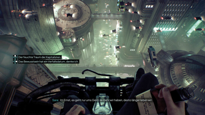 Die Präsentation ist dabei der große Star: In einem atmosphärischen Ego-Perspektiven-Mix aus Ridley Scotts ”Blade Runner” und viel Film noir lauscht Ihr toll vertonten Gesprächen und Monologen, zündet Euch Zigaretten an und spült ungesunde Mengen an Pillen mit ungesunden Mengen Alkohol runter. So linear sich der eigentliche Spielablauf präsentiert, so souverän gelingt regelmäßig, das imposante Trugbild einer durchdachten Welt aufzubauen. Visuell beeindruckende Panoramen verwöhnen das Auge mit regengepeitschten Neon-Stadtkulissen, die sich irgendwo zwischen schmutziger Sci-Fi-Dystopie und 1920er-Art-decó-Charme bewegen.