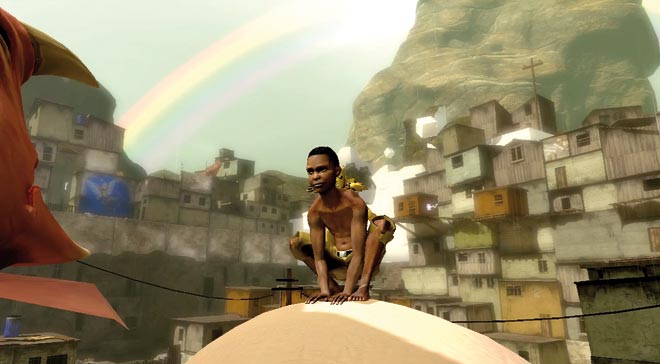 Also macht Ihr Euch auf die Suche nach dem, der Monster heilen kann. Es geht durch eine menschenleere surreale Stadt, die einer lateinamerikanischen Favela gleicht – mit endlosen bunten Häuserstapeln, Wellblechdächern und engen Straßen. Dabei müsst Ihr Rätsel und Sprungpassagen absolvieren, um neue Wege in dem Gassengewirr zu öffnen und manchmal sogar ganze Teile der Stadt umzugestalten. Viel Geschick ist dazu nicht notwendig: laufen, springen, mit Lulas Unterstützung etwas schweben – damit erschöpfen sich Quicos gut funktionierende Akrobatikkünste schon.