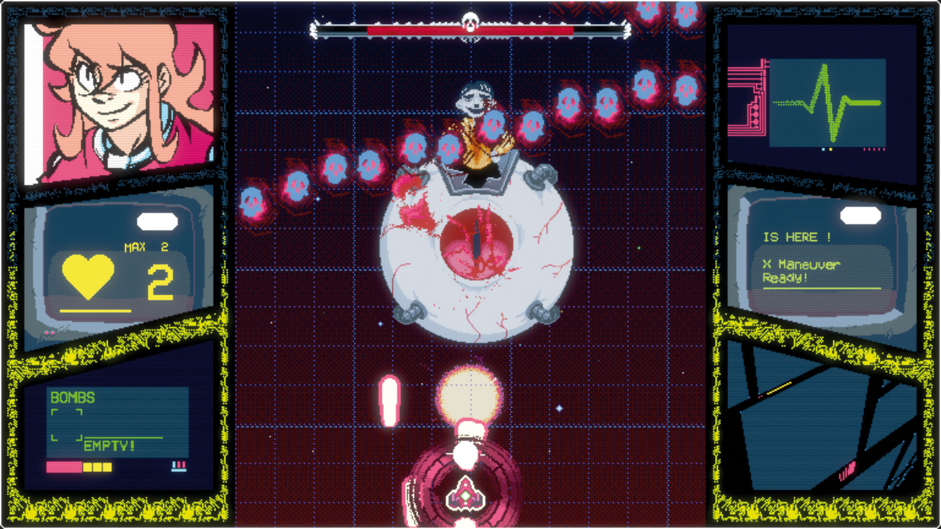 Auf den ersten Blick wirkt Project Starship X wie ein recht gewöhnlicher Vertikal-Shooter im bewusst leicht dreckigen Pixel-Look. Doch schnell erkennt Ihr, was Sache ist: Zum einen werdet Ihr oft vor gegnerischen Angriffen oder Formationen gewarnt, zum anderen ist der direkte Weg durch das Level häufig versperrt. Hier kommt der Dash zum Einsatz: Der geht zwar nur nach vorne oder schräg vorne, erlaubt Euch aber, gegnerisches Sperrfeuer unbeschadet zu überwinden. Auch Extra-Kapseln sammelt Ihr auf diese Art ein – wer gut aufpasst, kann so schon bald längere Kettenmanöver ausführen. Superschüsse erspielt Ihr Euch, und wenn Ihr mal fein manövrieren wollt, haltet Ihr den Feuerknopf gedrückt: Dann bewegt sich das Schiff besonders langsam und feinfühlig. Rogue-Elemente kommen beim Levelaufbau ins Spiel: Hindernisse und manche Gegnertypen ändern sich in jeder Runde – und die kann auch mal schnell vorbei sein. Gehen Eure Schilde zur Neige, war es das mit einem Durchgang. Trotzdem habt Ihr von der flott präsentierten Ballerei noch längst nicht alles gesehen, wenn der finale Boss erlegt ist.