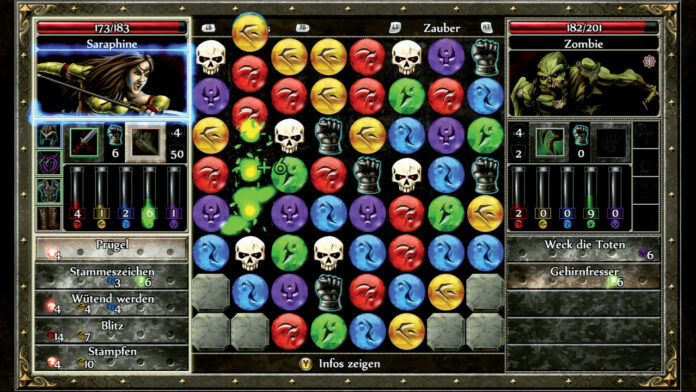 Nach dem krampfhaften Versuch, im Sci-Fi-Ableger Galactrix auf Teufel komm raus das Knobelkonzept zu ändern, bleibt das neue Puzzle Quest seinen Ursprüngen wieder nahezu sklavisch treu: Duelle werden im Fantasy-Abenteuer nicht nach Rollenspiel-Methode ausgefochten, sondern in einem unverhohlenen Bejeweled-Klon. Tauscht Juwelen und Totenköpfe, um Mana für Zauber bzw. Schaden für den Gegner zu sammeln. Neu sind Panzerhandschuhe, durch die der zusätzliche Einsatz von Waffen möglich ist – was sich jedoch von magischen Attacken spielerisch wenig abhebt. Gebastelt wurde derweil am Drumherum: Gefährten, Reittiere und aufrüstbare Heimstätten sind passé, dafür knobelt Ihr jetzt vermehrt mit Variationen der Grundmechanik, um z.B. Schatztruhen zu plündern oder Schlösser zu knacken. Damit geht Tiefgang verloren, zumal sich manche Aufgaben allzu häufig wiederholen. Im Abenteuer-Teil musste die klassische Kartenansicht einer isometrischen Perspektive weichen, durch die Euer gezeichnetes Heldensprite nun wuselt – das ist etwas netter anzusehen, aber im Vergleich weniger übersichtlich. Die Story schließlich schafft das Kunststück, noch etwas flacher auszufallen und schickt Euch zudem häufig auf lange, eintönige Fußmärsche.
