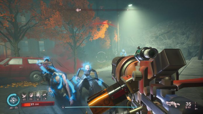 Dementsprechend wappnen wir uns mit Pflöcken, Schusswaffen und PSI-Fertigkeiten, um den merkwürdigen Machenschaften in der namensgebenden Stadt auf den Grund zu gehen. Wahlweise alleine oder mit bis zu drei Mitspielern erkunden wir zwei in sich geschlossene Areale und stoßen dabei immer wieder auf Hinweise, die die geheimen Experimente hinter dem von in Wellen eingefrorenen Städtchen häppchenweise lüften. Im Dämmerlicht der verdunkelten Sonne durchforsten wir Gebäude, Absturzstellen und Höhlen nach unnützem Krimskrams und treffen dabei natürlich auf allerlei Gegner, die uns eigentlich das Leben schwermachen wollen. Doch leider bleibt es bei ”wollen”, denn die KI erweist sich als ziemlich durchwachsener Haufen Amöben: Während eine Gruppe bewaffneter Sicherheitstruppen auf einem Dach Wache schiebt, jagen wir einem der Typen eine Kugel in den Kopf. Doch statt Alarm zu schlagen und dem Ursprung auf den Grund zu gehen, glotzt der Rest der tiefenentspannten Truppe lieber weiter dumm aus der Wäsche. Zwar stehen uns so ein paar freiwillige Kugelschwämme zur Verfügung, so wirklich spannend ist das aber auf Dauer nicht.