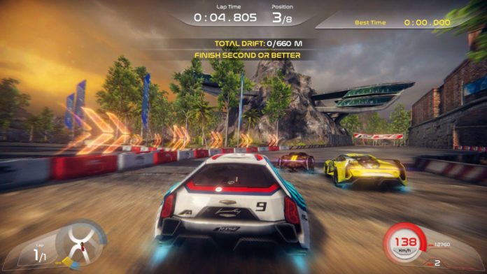 Als Pilot einer futuristischen Kreuzung aus Rennwagen und Hovercraft flitzt Ihr über Kurse mit Asphalt-, Feldweg- oder Wasseruntergrund. Neben normalen Meisterschaften warten ligaweise Herausforderungen, bei denen neben der Platzierung auch mal Zeit, Drifts oder andere Sonderbedingungen zur Qualifikation herangezogen werden.