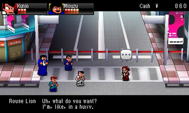 Kunio, Chefschläger der Nekketsu Highschool, hat wieder Ärger – klar, dass da nur ein Fausttanz quer durch Tokio hilft! Wie zu seligen NES-Zeiten prügelt Ihr Euch mit Schlägen, Tritten und diversen Waffen durch die mittlerweile polygonalen Straßen. Wie in einem Rollenspiel bekommt Ihr für besiegte Gegner Erfahrungspunkte und Geld – Letzteres investiert Ihr in Nahrung oder neue Kampfmanöver. Das Spielprinzip ist simpel aber spaßig, die Sprites herrlich ausdrucksstark und die Chiptunes gehen prima ins Ohr. Leider wird eine Möglichkeit, im zentralen Story-Modus zu zweit anzutreten, schmerzlich vermisst: Gemeinsam dürft Ihr nur im “Dodgeball”- und “Rumble”-Modus ran.