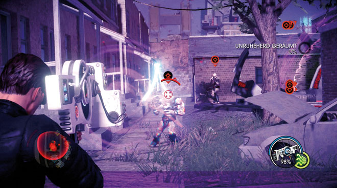 Es macht aber schon einen Unterschied, ob man mit Super-Speed einen Parcours zu Fuß absolviert oder im Alien-Mech um sich ballert, statt irdische Hilfsmittel zu verwenden. So unterhält es auch eine Weile länger, ähnlich einem Prototype oder dem indizierten Crackdown-Duo Gebäude zu erklimmen und in großen Sprüngen über die Dächer zu segeln, als einfach ein Auto zu klauen. Jedoch wird der Ansatz nicht konsequent durchgezogen: Wollt Ihr etwa einen Alien-Stützpunkt ausräuchern, ist es über weite Strecken effizienter, konventionell zu ballern, statt die eigentlich wirkungsvollen Superkräfte ins Spiel zu bringen es sei denn, Ihr trefft auf spezifische Gegner, denen Ihr anders nicht beikommen könnt.