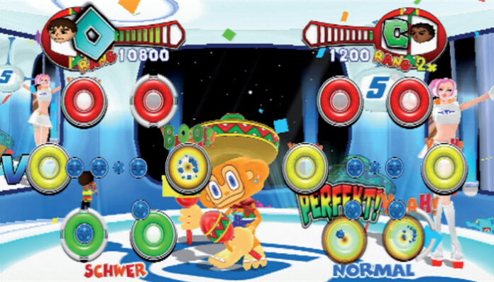 Das einfache Konzept blieb unverändert: Passend zur Musik fliegen bunte Kugeln aus der Bildmitte auf sechs Markierungen zu und müssen zeitgenau ’weggerasselt’ werden. Was im Original durch die Höhenabfrage der Maracas geschah, wird nun auf Remote- und Nunchuk-Bewegungen umgedeutet. Ihr neigt die Wii-Controller nach oben, vorne und unten, um die richtige Stellung zu treffen. In der Praxis entstehen so Bewegungsabläufe, die dem alten Vorbild angemessen nahekommen. Einige Kompromisse lassen sich jedoch nicht übersehen: Die Abfrage der Controller nimmt es zu Euren Gunsten mit der Genauigkeit nicht immer so genau und fühlt sich so gelegentlich schwammig an. Negativ wirkt sich das zum Glück kaum aus, nur beim gelegentlichen Posen fallen einige Kombinationen schwer.