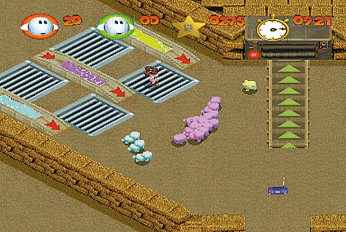 In Gestalt eines der Hirten habt Ihr nun die Aufgabe, die Vierbeiner in sechs Welten mit insgesamt 21 Spielstufen zu retten. Ihr dirigiert Euren Helden aus einer versetzten Vogelperspektive durch bunte Bitmap-Landschaften und scheucht mit Bewegungen oder Rufen die Viecher vor Euch her. An sich kein Problem, würde nicht jede Rasse anders reagieren und an jeder Ecke eine tödliche Gefahr auf die Wollknäuel lauern. Die Level sind nämlich gepflastert mit Fahrzeugen, Elektrozäunen, Flüssen und anderen lebensbedrohlichen Barrieren wie mechanischen Riesenhammern oder gierigen Schermaschinen. Die Jagd nach den schutzbedürftigen Viechern führt Euch vom ländlichen Bauernhof über ein riesiges Raumschiff bis in einen lärmenden Techno-Tempel – an Abwechslung mangelt es bei Sheep wahrlich nicht.