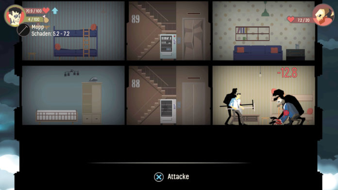 Skyhill folgt der klassischen Rogue-Formel: Das aus der Seitenansicht gezeigte Hotel wird in jeder Runde neu generiert, der Tod kommt meist schnell, und hat er Euch ereilt, geht der Kampf ums Entkommen wieder ganz von vorne los. Das Einzige, was Ihr mitnehmen könnt, sind gewisse Vorteile aktiver und passiver Natur: Die spielt Ihr frei und dürft dann vor Beginn einer neuen Runde einen wählen. Das Spiel läuft rundenbasiert ab: Jede Aktion kostet ein wenig Energie von Eurer Hunger-Anzeige – ist die erst einmal leer, wird Euch wertvolle Lebensenergie angekratzt. Mit gefundenen Nahrungsmitteln und Verbandskästen haltet Ihr Euch einigermaßen zusammen, aus Rohstoffen bastelt Ihr Werkzeuge und Waffen – schon ein simpler Besen macht den Kampf gegen die Mutanten weitaus einfacher. Gegner haben drei Trefferzonen, die Ihr im menübasierten Gefecht anwählt – je niedriger die Trefferwahrscheinlichkeit, desto höher der potenzielle Schaden.
