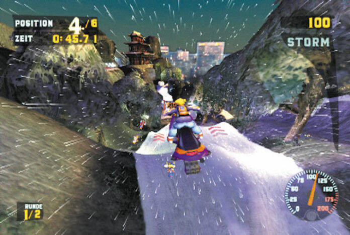 Acht abenteuerlustige Charaktere (von denen Ihr die meisten erst freispielen müsst) stehen zur Verfügung und bringen ihre eigenen Fahrzeuge mit. Anfangs sind die mit ein oder zwei Ketten ausgerüsteten Karren noch etwas schwach auf der Brust, erst durch Rennsiege erhaltet Ihr aufgebohrte Modelle mit mehr Leistung. Um sich in der Meisterschaft für den nächsten Kurs zu qualifizieren, genügen dagegen anfangs auch dritte und zweite Plätze – allerdings wollen die erstmal erreicht werden. Denn fünf aggressive Konkurrenten balgen sich mit Euch um die vorderen Positionen, außerdem haben es die sieben Strecken in sich: So beginnt Ihr in einem noch relativ gewöhnlichen kanadischen Bergtal, doch schon bald geht’s u.a. ins Bermuda-Dreieck, zu einem durchgeknallten Jahrmarkt in den USA und selbst nach China. Neben scharfen Kurven bzw. abgedrehten Kulissen warten viele gewagte Sprünge über gähnende Schluchten sowie zeitsparende Abkürzungen darauf, von Euch genommen zu werden. Allerdings sind letztere oft gut versteckt oder nur mit Hilfe eines kräftigen Temposchubs zu erreichen. Diesen ‘Storm’-Boost füllt Ihr durch das Demolieren von Randobjekten oder mit spektakulären Tricks in der Luft auf. Zusätzlich gewinnt Ihr so Zähler fürs Punktekonto: Sprengt Ihr eine vorgegebene Grenze, steht ein neuer Fahrer bereit.
