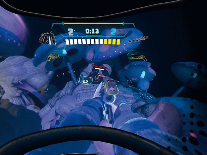 Unterwegs sammelt Ihr Gesundheits- und Rüstungs-Goodies, außerdem verteilen sich Waffen wie Pistole, Schrotflinte, Automatikgewehr, Lichtsäbel sowie ­Energieschilde in den ­Levels. Vorsicht jedoch vor dem Rückstoß mancher Wummen, der Euch nach hinten schiebt und das Zielen erschwert. In virtuellen Lobby-Räumen versammeln sich Spieler-Avatare für die nächste Partie und dürfen vorab miteinander interagieren.