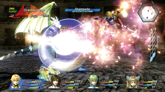 Nachdem sich moderne Energiewaffen zur Bekämpfung der spinnenartigen Fauna von Aeos als nutzlos erweisen, greift Edge zum Technoschwert und folgt – SciFi hin oder her – dem gut ausgetretenen Pfad so vieler Fantasy-RPG-Helden vor ihm. Altbekannt, jedoch nicht altbacken, denn tri-Ace interpretiert die Formel aus Erkundung, Monsterkämpfen und Partyverbesserung genau an den richtigen Punkten neu. The Last Hope schaltet z.B. bei Feindkontakt in eine extra Kampfarena, zeigt Euch aber vorher jeden Gegner fair in der Oberwelt. Dadurch könnt Ihr die Kampfreihenfolge recht gut planen, versucht Gegnern in den Rücken zu fallen, um einen Kampfvorteil zu erzielen, oder entkommt mit einem kurzen Sprint aus gefährlichen Situa­tionen. Das Echtzeit-Kampfsystem, ohnehin ein Markenzeichen der Serie, wurde behutsam modernisiert und mit klug ausgetüftelten Neuerungen angereichert. Geübte Kämpfer lassen die Monsterbrut aus Echsenkriegern, Kampfdrohnen und dämonischen Ausgeburten mit perfekt getimten Ausfallschritten ins Leere schlagen, aktivieren dadurch den Blindside-Modus und initiieren hinter ihrem Gegner ein Effektgewitter aus einem halben Dutzend Spezialattacken. Ein übersichtliches Pausen-Ringmenü zur Verabreichung von Heilitems oder dem Austausch eines aktiven Charakters während eines Kampfes rundet dieses beste Element des Spiels hervorragend ab.