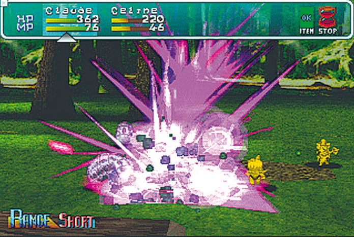 In dieser unwirtlichen Umgebung fühlt sich der junge Fähnrich Claude Kenni gar nicht wohl. Verständlich, denn schließlich kommt er aus einer weit entfernten Galaxis und war gerade dabei, mit seiner Mannschaft ein mysteriöses Energiefeld zu untersuchen, als er plötzlich auf diesen unbekannten Planeten teleportiert wurde. Seine Lage verbessert sich jedoch, als er ein hübsches Mädchen aus den Fängen einer grausamen Bestie rettet. Die dankbare Maid stellt sich als Rena vor und gewährt dem gestrandeten Raumfahrer Unterkunft im nahegelegenen Dorf. Dort wird der blonde Junge mit der geheimnisvollen Strahlenwaffe als Held einer alten Prophezeiung angesehen und prompt mit der Erforschung der ‘Hexenkugel’ betraut. Da sich Claude von den Erkenntnissen über den abgestürzten Meteoriten eine zügige Heimreise erhofft, sagt er zu und bricht zusammen mit der lieblichen Rena auf. Auf ihrer Reise erforschen die beiden zahlreiche gerenderte Hintergründe und schlagen sich mit zufällig auftauchenden Gegnern. Zu Beginn des Spiels dürft Ihr zwischen den beiden Hauptcharakteren wählen und die Geschichte entweder aus dem Blickwinkel von Claude oder Rena betrachten. Im Lauf der Zeit wird Eure Party durch zahlreiche Neuzugänge wie die Zauberin Celine oder den Kämpfer Ashton bereichert. Diese unterstützen Euch nicht nur im Kampf, sondern bieten gleichzeitig Anlass zu neuen Story-Wendungen: Fast ständig könnt Ihr sogenannte Einzelaktionen starten, bei denen Ihr jeweils einen bestimmten Charakter steuert. Diese Ereignisse beeinflussen den Lauf der Geschichte und führen zu einer von 80 möglichen Endsequenzen.