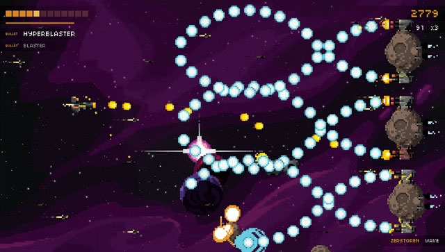 Ihr startet mit einer kurzen Einführung in die Steuerung, die sich noch an bekannte Muster hält: ballern, ausweichen und das Punktekonto erhöhen. Neben dem Standard-Schuss dürft Ihr eine Extrawaffe einsammeln und nutzen, darunter starker Laser, zielsuchende Raketen und sogar eine überdimensionale Kreissäge. Der große Unterschied zu bekannten Shoot’em-Ups ist das Zufallsprinzip von Steredenn: Gegnerformationen und Kugelmuster innerhalb der Abschnitte ändern sich bei jedem Neustart des Spiels, auch das Auftauchen besagter Extrawaffen fällt immer anders aus. Dank Energieleiste hält Euer Schiff zwar einige Treffer aus, wieder auffüllen könnt Ihr diese im Verlauf einer Stage aber nicht. Noch eine Spur knackiger wird es am Ende einer Stufe, wo Euch ein Boss-Schiff erwartet. Nach gewonnenem Kampf erhaltet Ihr nicht nur Eure komplette Energie zurück, sondern entscheidet Euch außerdem für eines von mehreren Upgrades – verstärkt beispielsweise Eure Primärwaffe oder erhaltet zwei weitere Lebenspunkte. Davon profitiert Ihr jedoch nur bis zum Ableben, denn dabei verliert Ihr sämtliche Extras und müsst das Spiel ganz von vorn beginnen.