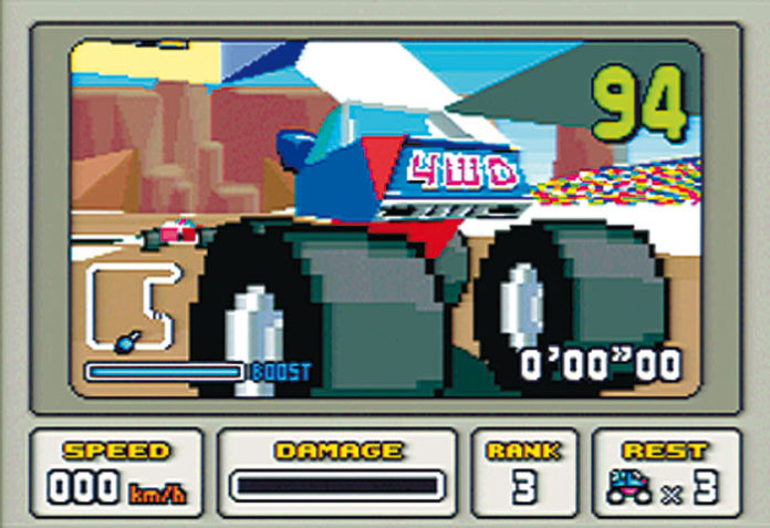 Doch Nintendo verzichtet auf die direkte Konkurrenz zu Segas ernsthaftem Formel-1-Simulator und inszeniert ein humoristisches Schnauferl-Rennen mit grafischen Übertreibungen und Slapstick-Einlagen. Altmeister Shigeru Miyamoto (siehe Interview auf den nächsten beiden Seiten) ist der Regisseur des Grand Prix mit Witz, bei dem alle Autos ein knuffiges Gesicht mit großen Kulleraugen haben. Im Gegensatz zu den Raumgleitern aus Star Wing ist Euer Polygon-Fahrzeug animiert und bewegt sich wie Donald Ducks Comic-Cabrio. Wenn Ihr mit dem Wagen durch Halfpipes brettert, spürt Ihr fast schon die weiche Federung. Euer Renner ist ein Auto wie aus Gummi, an dem selbst der härteste Crash keine Spuren hinterläßt – nur wenn Ihr zu oft in Gegner oder Leitplanken rauscht, fliegen Euch die Einzelteile des Fahrzeugs um die Ohren. Im ”Speed Trax”-Modus (nur hier fahren Computergegner mit) wählt Ihr zwischen drei Flitzern. Nach Motorleistung und Gewicht der Renner richten sich Beschleunigung und Höchstgeschwindigkeit. Doch je leichter ein Fahrzeug gebaut ist, desto schneller fliegt es beim Crash auseinander – eine ”Damage”-Anzeige gibt Auskunft über den Zustand der Karosserie. Jedem Auto steht für wenige Sekunden ein ”Boost” zur Verfügung, der Euch blitzschnell auf Höchstgeschwindigkeit bringt. Mit Extras, die am Wegesrand verstreut liegen, könnt Ihr Boost-Energie zurückgewinnen oder Ersatzteile einheimsen. Bonus-Stages zwischen den Etappen ergänzen die Saison.