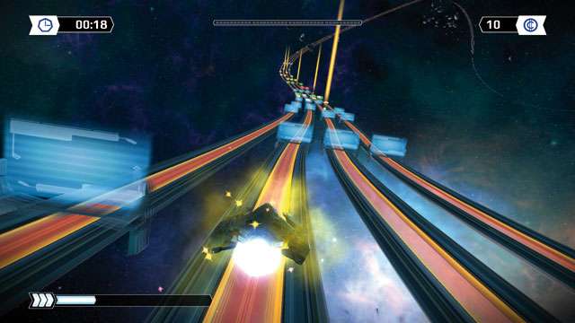 Zwar geht es weiterhin primär darum, auf mehrspurigen Schienenkonstrukten zum Ziel zu rasen und Hindernissen auszuweichen, zum Freischalten späterer Levels müsst Ihr aber Energiekugeln sammeln. Die findet Ihr nur auf halbem Weg in einer sich arg schwammig spielenden Flugsequenz und verliert sie hinterher bei Kollisionen – paradoxerweise ist viel Bremseinsatz also Pflicht. Zusammen mit der flüssigen, aber unspektakulären Optik und einer arg langatmigen Karriere-Struktur bleibt Switch Galaxy Ultra im Mittelmaß stecken.