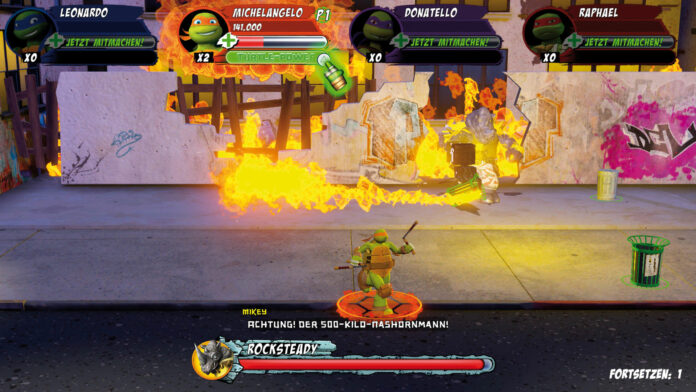 Das Spielsystem gestaltet sich denkbar simpel: Mit einem Knopf schlagt Ihr zu, mit dem anderen springt Ihr – aus diesen Aktionen und ein paar herumliegenden ­Extras und Items kombiniert Ihr Eure Angriffe. Ihr werft Gegenstände auf Feinde, lockt sie zu ­Hydranten, um sie mit Wasserdruck zu erlegen, oder packt bei voller Superleiste einen Spezial­angriff aus. Andere bekannte Gesichter aus der ­Serie schauen gelegentlich vorbei und greifen Euch unter die Arme. Gegner ­attackieren Euch derweil aus sämtlichen Richtungen, das macht die aktuelle Turtles-­Hauerei schwieriger und weniger präzise als die alten Bitmap-Prügler der 1980er und 1990er, auch eine leichte Verzögerung bei Euren Angriffen solltet Ihr mental einrechnen. Genretypisch steigt natürlich der Spaß mit der Anzahl der Mitspieler.