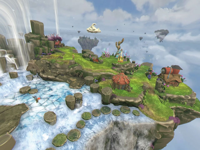 Dass Aufbaustrategie auch in Virtual Reality funktioniert, will Tethered beweisen. Auf schwebenden Inseln errichtet Ihr Euer Reich, in dem Ihr Euch um kleine “Peeps” kümmert. Die Racker schickt Ihr zu Ressourcen, damit sie automatisch Holz, Stein, Metall und Nahrung abernten. Die Rohstoffe werden zentral an einem Totem gelagert, das auch Eure Macht per Energiekugeln steigert. Damit schalten sich neue Baugebiete frei, auf denen Ihr Gebäude errichtet. Kommandos erteilt Ihr mit der korrekten Blickrichtung auf einen der Untergebenen, dem Druck auf die X-Taste und schließlich auf das gewünschte Ziel. Diese Steuermethode funktioniert auch mit dem Wetter: Sporadisch auftretende Wolken, die Regen, Schnee oder Sonne spenden, schickt Ihr zwecks Pflanzenwachstum zu Feldern oder lasst sie Gewässer einfrieren.