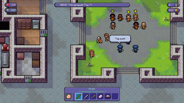 Euer Tagesablauf ist weitgehend vorgegeben: Vom morgendlichen Antreten über Essenszeiten, Arbeitsphasen und knapp kalkulierter Freizeit bis hin zur Abendkontrolle müsst Ihr feste Regeln befolgen, sonst fallt Ihr sofort auf keine gute Idee für einen potenziellen Flüchtling. Deshalb erkundet Ihr die Umgebung und organisiert Helfer und Hilfsmittel besser subtil. Durch das Erfüllen von Knastjobs (mit knappen Zeitlimits) oder Gefallen für andere Häftlinge verdient Ihr Geld, das zum Kauf konspirativer Güter dient. Letztere nutzt Ihr u.a. für Minecraft-artiges Crafting, um wirksamere Werkzeuge zu basteln. Waren geben Euch andere aber nur, wenn sie Euch mögen: Verdrescht Ihr einen Knacki, nimmt er Euch das meist übel und lauert Euch auf, was Wächter argwöhnisch machen kann.