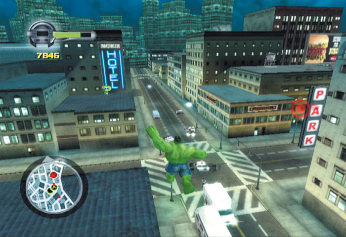 Versicherungsgesellschaften wird mit dem Auftauchen von Hulk Angst und Bange. Wo das grüne Ungetüm erscheint, hinterlässt es eine Schneise der Verwüstung – Sach- und Personenschäden in Millionenhöhe sind die Folge. Im neuesten Konsolenauftritt des Superhelden geben die Entwickler ihrem destruktiven Riesen-baby gar eine komplette 3D-Stadt zum Austoben. Kollege Spider-Man hat’s vorgemacht: Story-Missionen laufen bei Ultimate Destruction nicht in vorgegebener Reihenfolge ab, sondern können frei Schnauze im Stadtgebiet angesteuert werden. Zwischendurch hüpft und boxt Ihr Euch durch Straßenverkehr und Polizeisperren, legt ganze Straßenblöcke in Schutt und Asche oder sucht nach versteckten Bonusitems. Mit steigender Zerstörung könnt Ihr neue Schlagcombos kaufen.