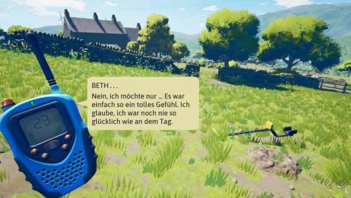 Leider beweist The Magnificent Trufflepigs aber, dass diese Schlussfolgerung eine Binsenweisheit ist: Ein paar Stunden lang latscht Ihr hier im gemächlichen Tempo in der Ego-Sicht über die Felder einer idyllischen britischen Farm und sucht mit einem Metalldetektor nach vermeintlich wertvollen Dingen. Warum? Weil Euch eine alte Bekannte darum gebeten hat. Wenig überraschend plaudert Ihr mit der laufend via Walkie-Talkie und hört Euch deren Sorgen und Nöte an.