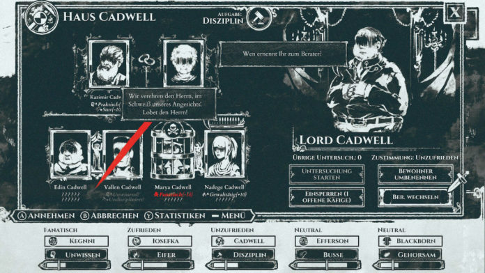 Tugend und Schwäche jedes Familienmitglieds sind anfangs verborgen, nur durchs tuschelnde Volk angedeutet. Die Rätewahl ist somit noch Glücksspiel: Beruft Ihr mit Nicolai K. einen genialen Bauherrn oder aber einen größenwahnsinnigen Schurken? Erst durch priesterliche Untersuchungen enthüllt Ihr nach und nach Talente und Laster, sperrt Versager zur Läuterung in den Kerker und schlachtet am Quartalsende den größten Sünder des Stadtrats. Rumgeschnüffel, Kerker und Hinrichtung gefallen den Clans natürlich nicht: Treibt Ihr eine Familie zur Rebellion, endet Eure Priesterherrschaft vorzeitig und abrupt – ebenso, wenn einer der fünf göttlichen Parameter zu Neujahr im roten Bereich steht.