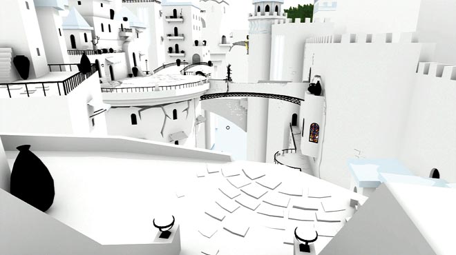 Das funktioniert ironischerweise wie in einem Ego-Shooter, doch statt blauer Bohnen verschieße ich schwarze Farbkugeln, die ihre düstere Spur auf der Umgebung hinterlassen erst dadurch erkenne ich Raumgeometrie und Objekte (siehe Bildreihe rechts oben). Später wird das weiße Nichts von einem Städtchen in zaghaften Grautönen abgelöst (großes Bild), die schwarzen Kugeln weichen Wasserbömbchen, mit denen ich den Pflanzenbewuchs des einst blühenden Herrschaftssitzes reanimieren kann (Bilder unten). Das dritte Kapitel schließlich verblüfft mit einem optischen Bruch und gibt mir ein Rätsellösungstool an die Hand, das entfernt an Portal erinnert. Dass der Titel wie schon Journey von Sonys Santa-Monica-Studio produziert wurde, erkennt Ihr nicht nur an einem netten Easter Egg, sondern spiegelt sich auch im Schlussakt wider lasst Euch überraschen! Auch die Geschichte rund um unfertige Gemälde, einen narzisstischen König, fliegende Schwäne und Tonkrüge, in die sich unzufriedene Bürger erleichtern, ist sympathisch, witzig und angenehm unverkrampft.