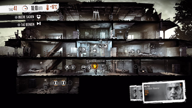 Ihr müsst stets im Auge behalten, wie es Euren Mannen geht. Sind sie zu müde, hungrig oder deprimiert, werden sie langsamer und verweigern manches Mal die Arbeit. Wer aber nur herumsitzt, wird des Nachts von Plünderern ausgeraubt, stirbt im Winter den Kältetod und muss auf dem nackten Boden schlafen. Also lasst Ihr jemanden aus kargen Zutaten Essen kochen, baut Werkzeuge und Waffen, lasst erkrankte und müde Gruppenmitglieder ausruhen und hört das Radio nach neuen Nachrichten ab. Das Problem: Ihr werdet nie genug Ressourcen haben, um alle Bedürfnisse zu erfüllen, ständig müsst Ihr abwägen, was gerade das kleinere Übel ist. Was tut Ihr, wenn Ihr nur noch eine Essensportion habt, sich aber zwei Eurer Leute den Bauch halten und dazu noch Kinder an der Tür um Nahrung betteln? Egal was Ihr unternehmt, es bleibt ein ungutes Gefühl.