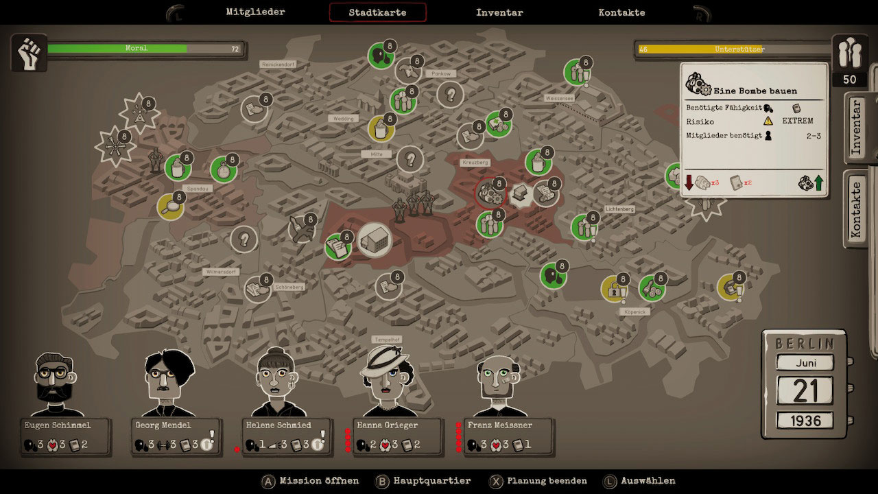 20 Runden lang unternehmt Ihr Maßnahmen gegen das Nazi-Regime. Diese werden dominiert von ressourcenorientierten und wiederkehrenden Aktionen wie dem Sammeln von Spenden, dem Materialkauf für den Druck von Flugblättern bis hin zu Gesprächen mit potenziellen Unterstützern. Darüber hinaus plant Ihr Sabotageakte, spioniert SA-Mitglieder aus oder rettet gefangene Mitstreiter. Jede Aktion birgt Risiken und Erfolgschancen, abhängig vom gewählten Verbündeten. Werdet Ihr erwischt, entscheidet Ihr Euch für Verstecken oder Flucht; wahlweise zieht Ihr die Aktion trotzdem durch, was mit Haft oder Tod enden kann. Primärziel ist jedoch stets, ausreichend Unterstützer zu haben und die Moral Eurer Gruppe hochzuhalten, da ansonsten das Spiel vorzeitig endet.