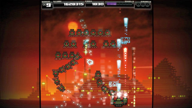 Der Archetyp des Weltraum-Shoot’em-Ups heißt zweifelsohne Space Invaders. Taitos legendärer Oldie hat aus heutiger Sicht aber ein Handicap – er ist ziemlich monoton. Dieses Problem plagt anfangs auch Titan Attacks!, das sich den Urvater als Hauptvorbild genommen hat doch zum Glück kommt die Ballerei auf Dauer mehr in Fahrt. Gekleidet in ein grafisch schickes wie buntes Retro-Korsett mit pixeligen Klotz-Feinden geht es 100 Levels darum, von oben einfallende Aliens zu erledigen. Die verhalten sich überwiegend wie klassische ”Invaders”, es gesellen sich aber auch Exemplare hinzu, die mehr Galaga oder auch Centipede als Inspirationsquelle haben. Übersteht Ihr eine Runde ohne Gegentreffer, erhöht sich der Bonusmultiplikator und Ihr verdient mehr Abschussprämie – das ist wichtig, denn von dieser rüstet Ihr Euer Vehikel auf und kauft neue Schutzschilde. So kommt eine begrüßenswerte Prise Taktik ins Geschehen, das zum Ende hin im Projektilrausch zunehmend chaotischer wird. Trotzdem startet Titan nie komplett durch, was auch am seltsam verhaltenen Soundtrack liegt. Als zwei- bis dreistündiges Ballerhäppchen ist’s dennoch gut verdaulich, wenn auch trotz Cross-Buy teuer – für die Xbox 360 gibt es den Spaß schon länger als Indie Game für schlappe 0,95 Euro.