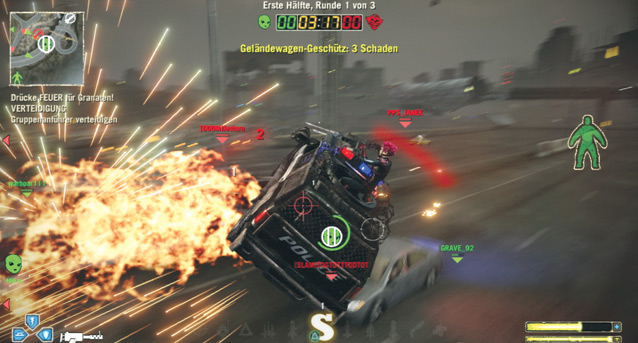 Oliver Ehrle meint: Die unkomplizierten Rempelrennen locken sowohl Einsteiger als auch Profis, da man mit der Zeit jede Menge fieser Tricks entwickeln kann: Streckenkenntnis ist wichtiger als Fahrtechnik, denn die Boliden halten sich sehr stabil auf der Strecke – die Lenkung ist fast zu klobig. Das gilt nicht für den Heli, der sich dank der allseits verfügbaren Fernlenkwaffen zum Glück nicht übermächtig spielt. Online verplempere ich leider viel Zeit mit Nase bohren, weil man in laufende Ranglisten-Matches (die meisten Räume spielen auf Liste) nicht einsteigen kann. Folglich muss man oft warten, bis sich entsprechend viele Piloten für ein Match einfinden. Mit der Cut-Version kann ich leben, die Schnitte betreffen vor allem Zwischensequenzen – im Spiel wird der Bildschirm reichlich mit dem Blut der zuschaltbaren Fußgänger besudelt.