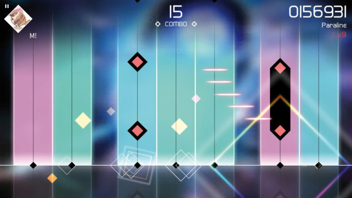 Im Rhythmus zum Song rauschen Rauten in mehreren Bahnen nach unten, die sich wiederum auch mal seitlich bewegen – diese simple, aber effektive Choreografie passt punktgenau zur Musik. Erreichen die Symbole den unteren Rand, müsst Ihr die passende Bahn antippen oder auch mal länger halten respektive die Bewegung mitgehen. Nebenbei schaltet Ihr durch das Erfüllen bestimmter Vorgaben Text- und Grafikseiten einer (überflüssigen) Rahmenhandlung frei – allerdings sind die Bedingungen ziemlich unausgewogen und teils nur für Profis machbar.