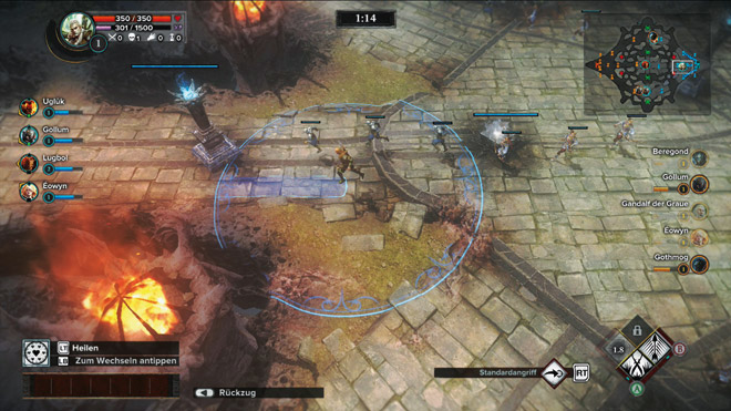 Auf den ersten Blick sind sich Wächter von Mittelerde und Awesomenauts recht ähnlich: Zwei Gruppen treten gegeneinander an, um die Basis des Gegners zu zerstören. Bei den Tolkien-Schlachten bilden jeweils fünf Wächter ein Team, dabei kämpfen schon mal z.B. Gandalf und Sauron Seite an Seite. Die Wächter wählt Ihr aus fünf Klassen aus: Taktiker, Zauberer, Verteidiger, Angreifer und Krieger. Das Angebot fällt mit über 20 Charakteren zufriedenstellend aus, zudem spielen sich die Helden und Schurken aufgrund individueller Bewaffnung und Spezial-Attacken angenehm unterschiedlich.