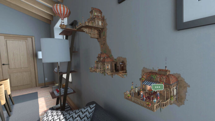 In einem von drei Szenarien helft Ihr als wohlwollender Gigant winzigen Menschen, eine Stadt zu gründen. Das Gimmick dabei: In diesem VR-Liliput entstehen die Gebäude und andere Örtlichkeiten an den Wänden oder auf dem Boden.