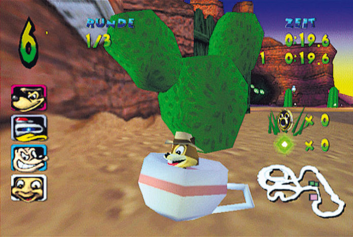 Zielsuchende Nus­s­rak­eten werfen den Gegner aus der Bahn, per Froschzauber lasst Ihr die Konkurrenten kurzzeitig als quakende Kröten über die Piste hüpfen. Boost­felder und Turbo­münzen beschleunigen die Fahrt; findet Ihr eine der zahlreich versteckten Ab­kürzungen, so setzt Ihr Euch nach einem Abstecher durch die Pampa einige Meter vor das Verfol­gerfeld. Zwar balgt Ihr Euch auf den meisten Kursen ‘nur’ um den ersten Platz, auf einigen Spezial-Strecken müsst Ihr aber auch unter Zeit­druck eine be­stim­mte Zahl Mün­zen einsammeln. Via Splitscreen dürfen bis zu vier menschliche Fahrer ge­gen­­ei­nan­der antreten.