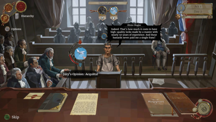 Eingebettet in eine Optik im hübschen Malerei-Stil schlüpft Ihr in die Haut des ehrenwerten Alexis Fidèle, der Tag für Tag seinen Pflichten als Richter, Politiker und Familienvater nachgehen muss. Zentraler Punkt der ungewöhnlichen Spielmechanik ist dabei die vielschichtige Tätigkeit hinter dem Richterpult, von dem aus Ihr verschiedene einprägsame Prozesse führt. Dabei gilt es, durch geschickte Vorbereitungen wie etwa die thematisch korrekte Zuordnung von Hinweisen der Anklageschrift und die so verfügbar werdenden Frageoptionen Licht ins Dunkel der Tathergänge zu bringen, um abschließend ein frei wählbares Urteil zu fällen und Ansehen bei verschiedenen Fraktionen zu erlangen.