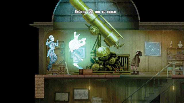 Die scrollenden 2D-Umgebungen wie auch die Animationen aller Charaktere sind handgezeichnet und sehr hübsch anzusehen, wer sich Zeit dafür nimmt, findet allerlei Details in den Kulissen. Nur die zum Glück sparsam eingesetzten Video-Sequenzen wirken ziemlich billig. Schnell kommt Ihr in den Besitz eines Amuletts, das Euch die entscheidende Fähigkeit verleiht: Auf Touchscreen-Druck verlässt Elenas Geister-Ich seinen Körper und kann so u.a. mit ehemaligen Bewohnern des Gemäuers plaudern, sich durch enge Gänge quetschen und von einigen Objekten Besitz ergreifen, um z.B. Schalter umzulegen. Die meisten Rätsel und Hindernisse setzen auf diese Mechanik und sind auch eher Mittel zum Zweck: Whispering Willows stellt das Erzählen seiner nicht zuletzt durch auffindbare Textdokumente abgerundeten, ordentlich inszenierten Story in den Vordergrund. Wer sich darauf einlassen kann, bekommt ein mit zwei bis drei Stunden nicht besonders langes, aber interessantes Abenteuer zu Gesicht.
